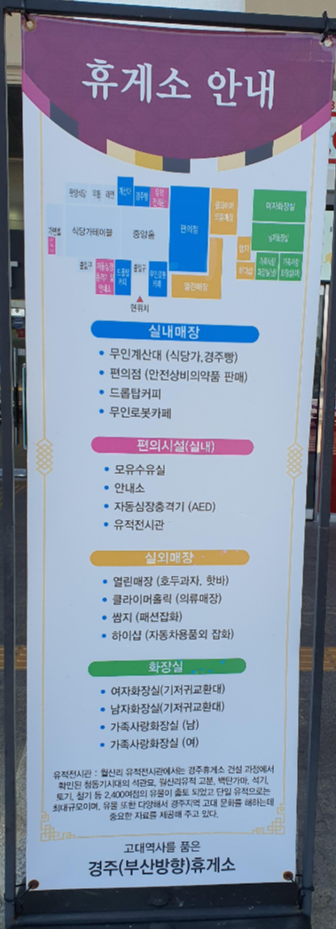 경주휴게소는 경부고속도로(부산 방향)에 위치한 휴게소입니다. 경상북도 경주시에 위치하고 있고 개장 초기에는 화물차 전용 휴게소였습니다. 현재는 일반 휴게소로 변경되어 영업 중입니다. 다른 휴게소와의 차이점으로는 한옥 양식으로 만들어져 있는 것이 특징입니다. 수유실 위치는 대부분의 휴게소들과 동일하게 실내에 위치하고 있습니다.