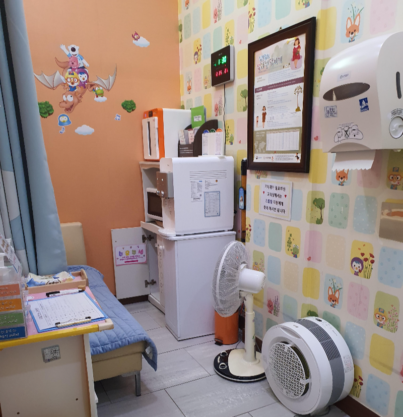 수유실 내부는 다른 휴게소 수유실에 비해 조금 작긴 했지만 필요한 것들은 모두 있었고 사용하는 게 불편함을 전혀 느낄 수 없었습니다. 수유는 하지 않고 간단하게 기저귀만 교체했지만 아늑한 느낌이 들었습니다. 특히 6개월 아기가 뽀로로 스티커에 관심이 있어서 벽을 두리번두리번 쳐다보게 되었습니다. 아기식탁의자는 수유실 바깥쪽에 위치하고 있어서 이유식을 먹이는 분들이라면 의자 위치를 미리 확인하는 것이 필요합니다.