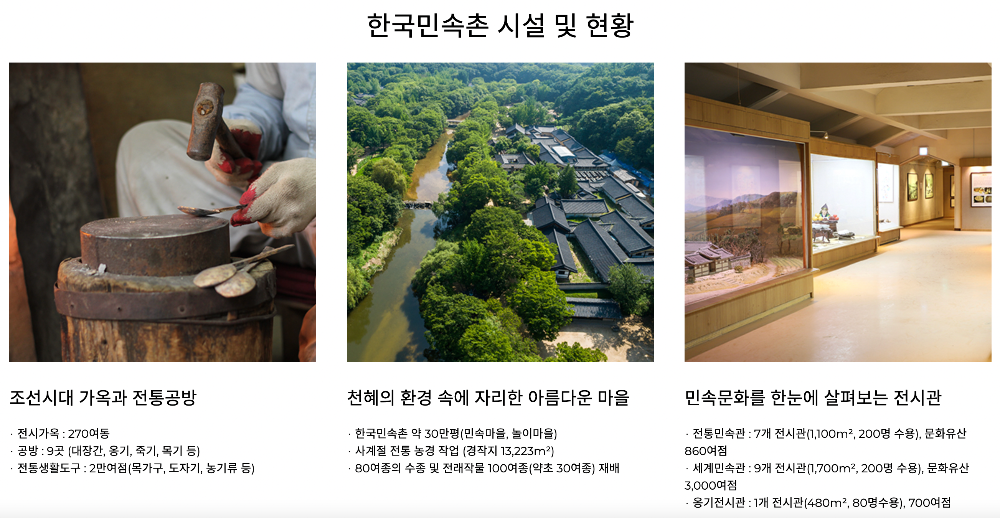 한국민속촌은 용인시 기흥구 민속촌로에 위치한 테마파크 입니다. 한국관광 100선에 선정될 만큼 많으 사람들에게 인기가 많은 장소 입니다. 이름 때문에 국립시설로 착각할 수 있지만 민간기업이 운영하고 있습니다. 1974년 개장하여 한국의 전통문화와 민속적인 삶을 재현하고 있습니다. 전통 기와집, 초가집, 관가, 반가, 주막등이 있고 도기 가마터, 유기 공방, 서당, 약방 등 조선시대 때의 건물들을 재현, 보존하고 있습니다. 한국민속촌 내에는 다양한 캐릭터들이 있는데 방문해서 궁금한 것들을 물어보거나 대화를 해보면 재밌는 상황이 연출되기도 합니다. 전통문화 외에도 특별한 이벤트를 개최하기도 하는데 방문하신다면 이벤트에 참여하면 더욱 즐거운 경험이 될 것입니다. 방문시 한복을 입고 가면 요금 할인을 받을 수 있고 용인 시민인 경우 가장 큰 할인 혜택을 받을 수 있으므로 할인 정책도 미리 확인해보는 것이 좋습니다. 주의할 점으로는 길이 대부분 흙길로 되어 있어 우천시 진흙바닥이 되므로 비오는 날 관람 하려면 참고하면 좋습니다.