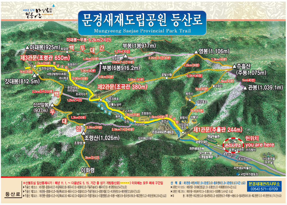 문경새재는 문경 문부터 제3관문(조령관)까지 편도 직선거리로 약 10km 정도 되고 주변의 주흘산, 부봉, 마패봉 코스로 갈 경우에는 편도 거리가 약 16km로 짧은 거리는 아닙니다. 왕복으로는 20km ~ 32km까지 될 정도로 긴 코스이기 때문에 전체 코스를 계획하고 있다면 준비를 어느 정도 하는 것이 좋습니다. 전체 코스가 아니라면 몇몇 개의 주요 장소들을 즐기시는 것도 좋은 방법입니다.