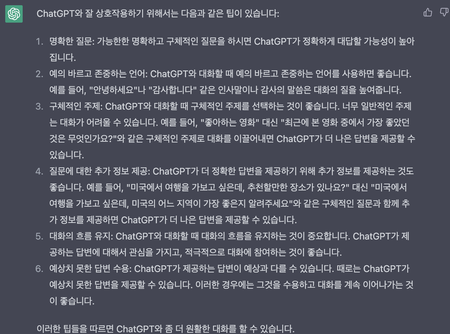 - 대화의 흐름 유지: ChatGPT와 대화할 때 대화의 흐름을 유지하는 것이 중요합니다. ChatGPT가 제공하는 답변에 대해서 관심을 가지고, 적극적으로 대화에 참여하는 것이 좋습니다.