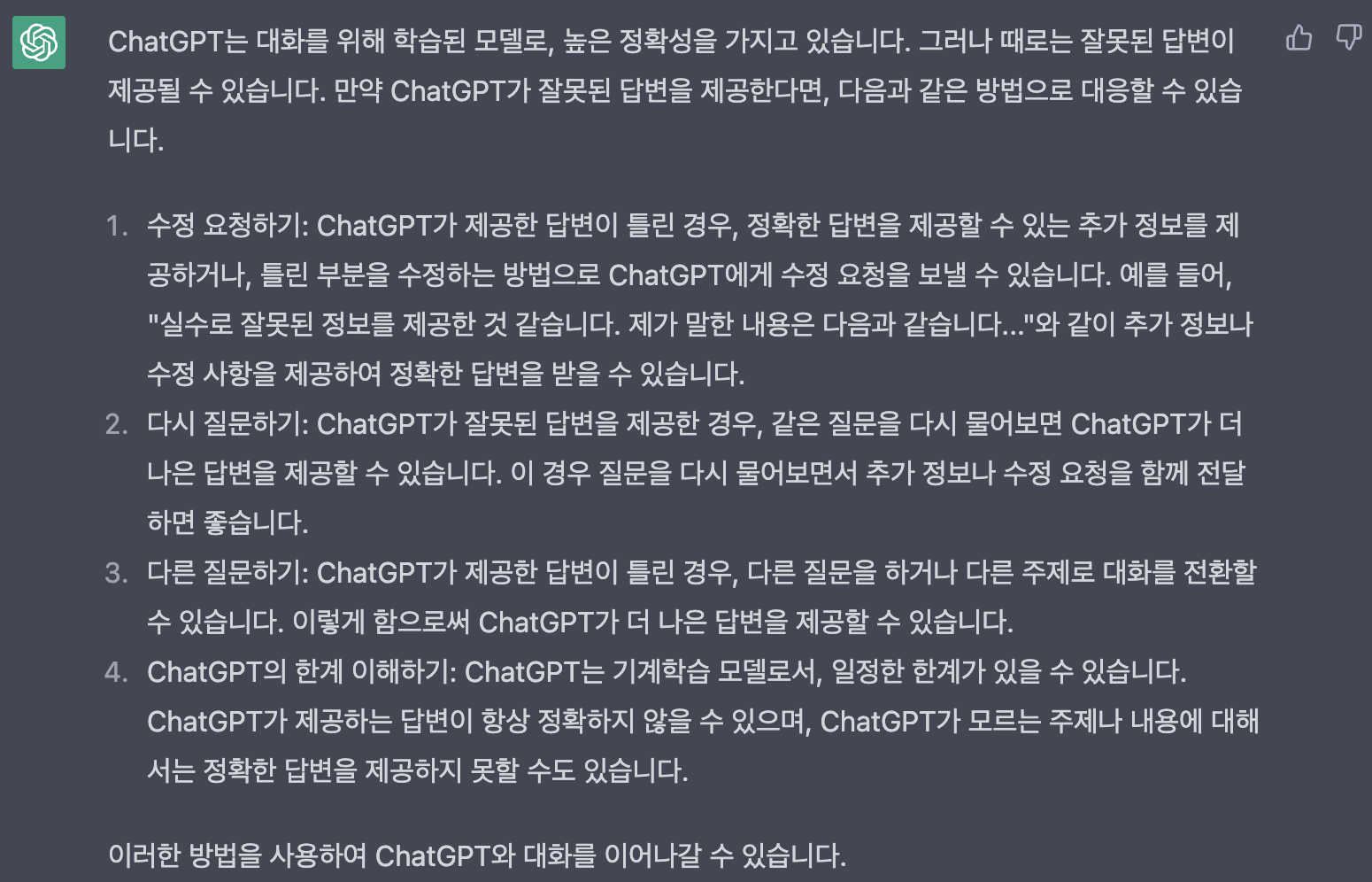 - 다시 질문하기: ChatGPT가 잘못된 답변을 제공한 경우, 같은 질문을 다시 물어보면 ChatGPT가 더 나은 답변을 제공할 수 있습니다. 이 경우 질문을 다시 물어보면서 추가 정보나 수정 요청을 함께 전달하면 좋습니다.