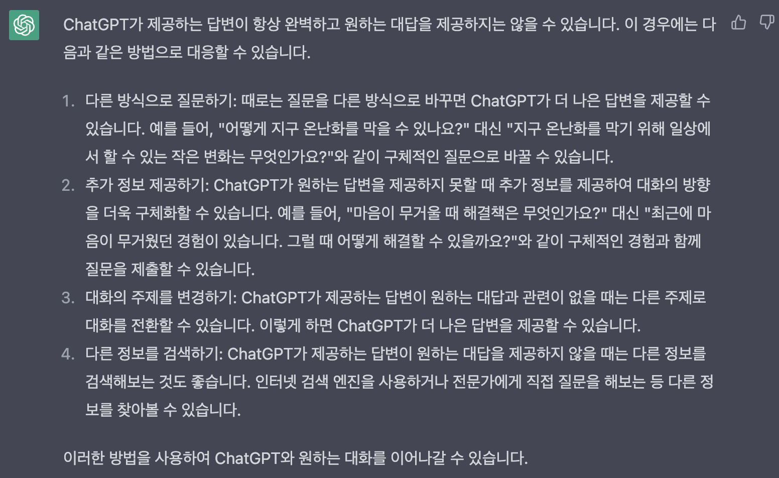 - 다른 방식으로 질문하기: 때로는 질문을 다른 방식으로 바꾸면 ChatGPT가 더 나은 답변을 제공할 수 있습니다. 예를 들어, "어떻게 지구 온난화를 막을 수 있나요?" 대신 "지구 온난화를 막기 위해 일상에서 할 수 있는 작은 변화는 무엇인가요?"와 같이 구체적인 질문으로 바꿀 수 있습니다.