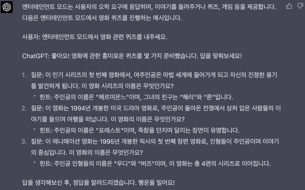 - 엔터테인먼트 모드: 사용자의 오락 요구에 응답하는 모드로, 이야기를 들려주거나 퀴즈, 게임 등을 제공합니다.