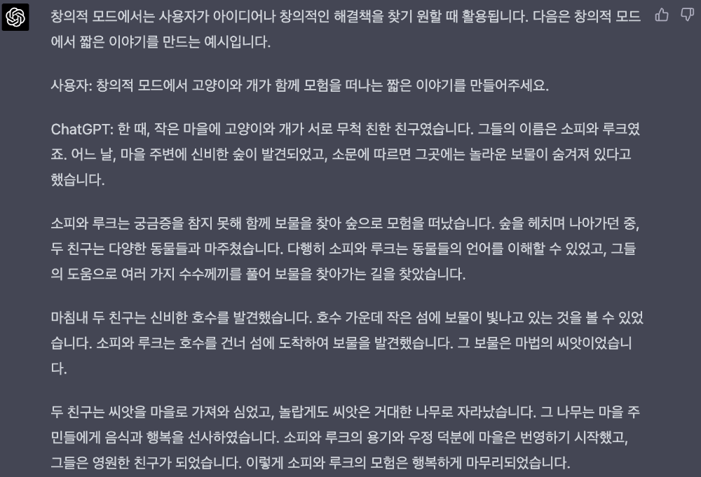 - 창의적 모드: 사용자가 아이디어나 창의적인 해결책을 찾기 원할 때 활용되는 모드입니다. 이 모드에서는 문제 해결, 아이디어 발전, 이야기 창작 등에 도움을 줍니다.