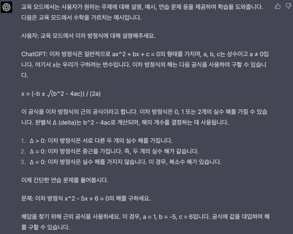 - 교육 모드: 사용자가 특정 주제에 대해 배우고자 할 때 사용하는 모드입니다. 이 모드에서는 주제에 대한 설명, 예시, 연습 문제 등을 제공하여 학습을 도와줍니다.